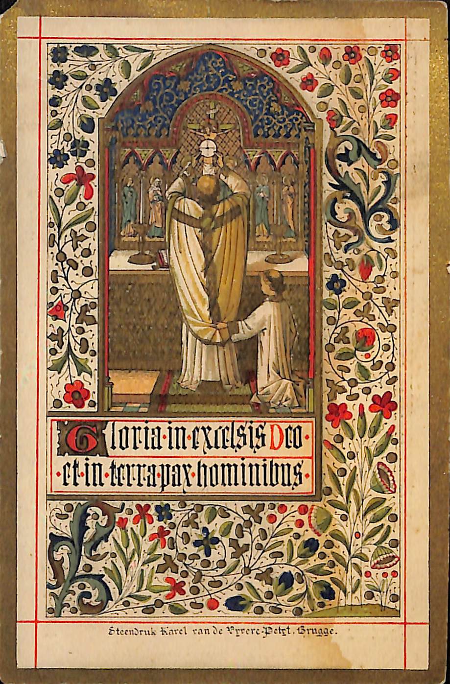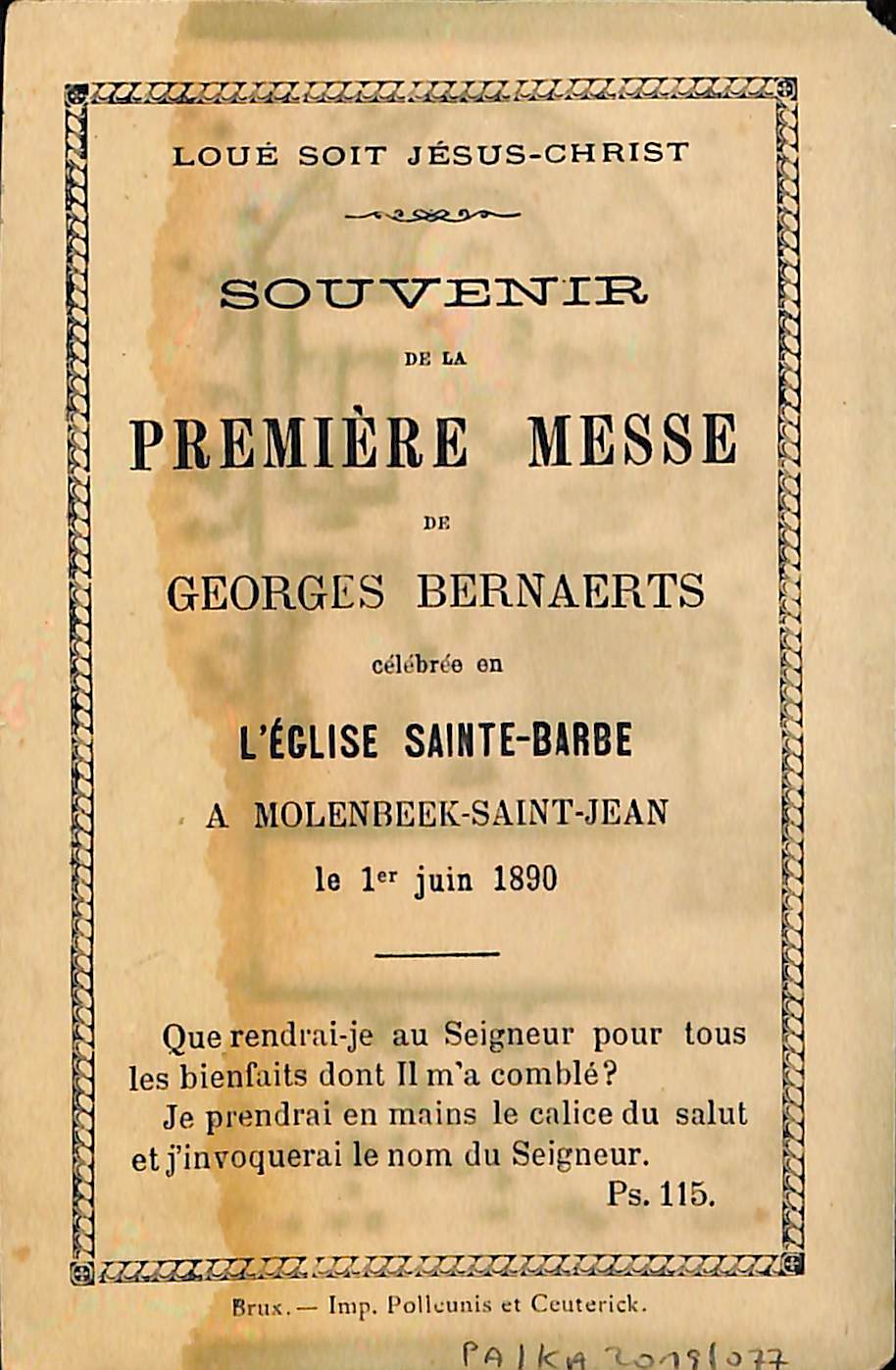 Devotieprentje Herinnering aan de eerste mis van Georges Bernaerts in de Sint-Barbarakerk (Sint-Jans-Molenbeek), drukk. Karel van de Vyvere-Petyt (Brugge), 1890.