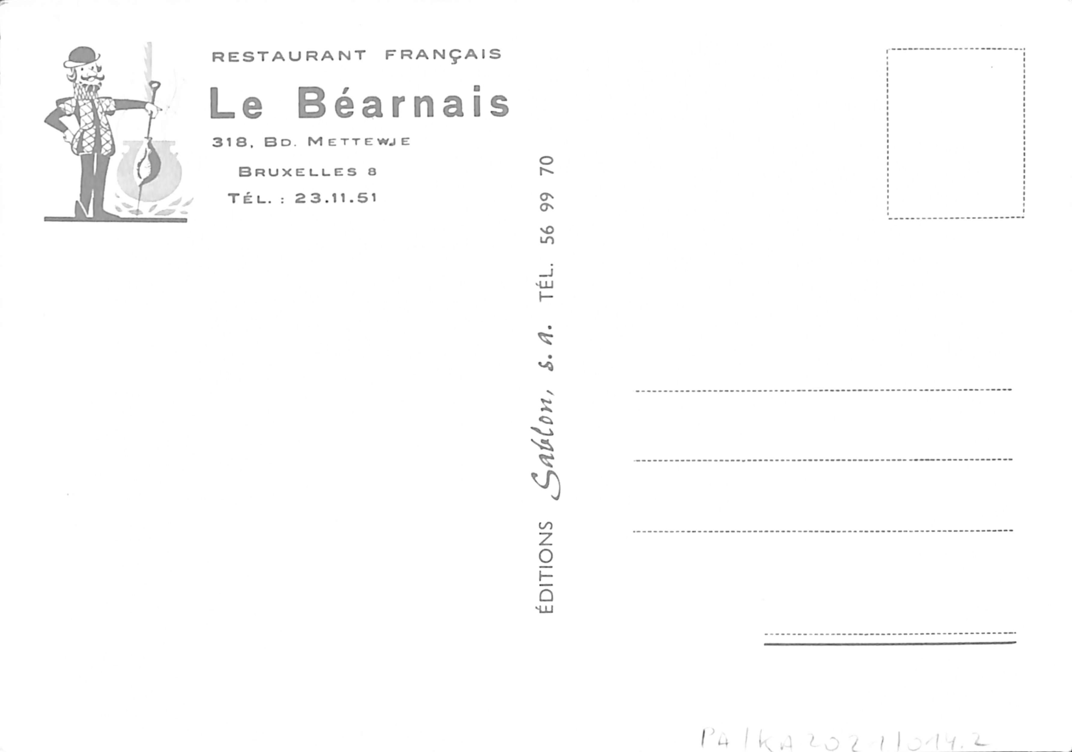 "Restaurant français / Le Béarnais / 318, Bd. Mettewie / Bruxelles / Tél. : 23.11.51"