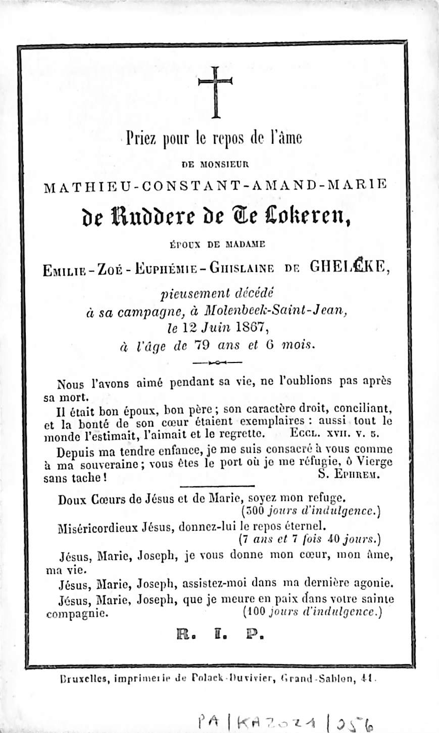 Souvenir pieux Mathieu de Ruddere de Te Lokeren (overleden in Sint-Jans-Molenbeek, 1867), uitg. Alcan (Parijs), uitg. Alcan (Parijs) - drukk. Polack-Duvivier (Brussel), 1867.