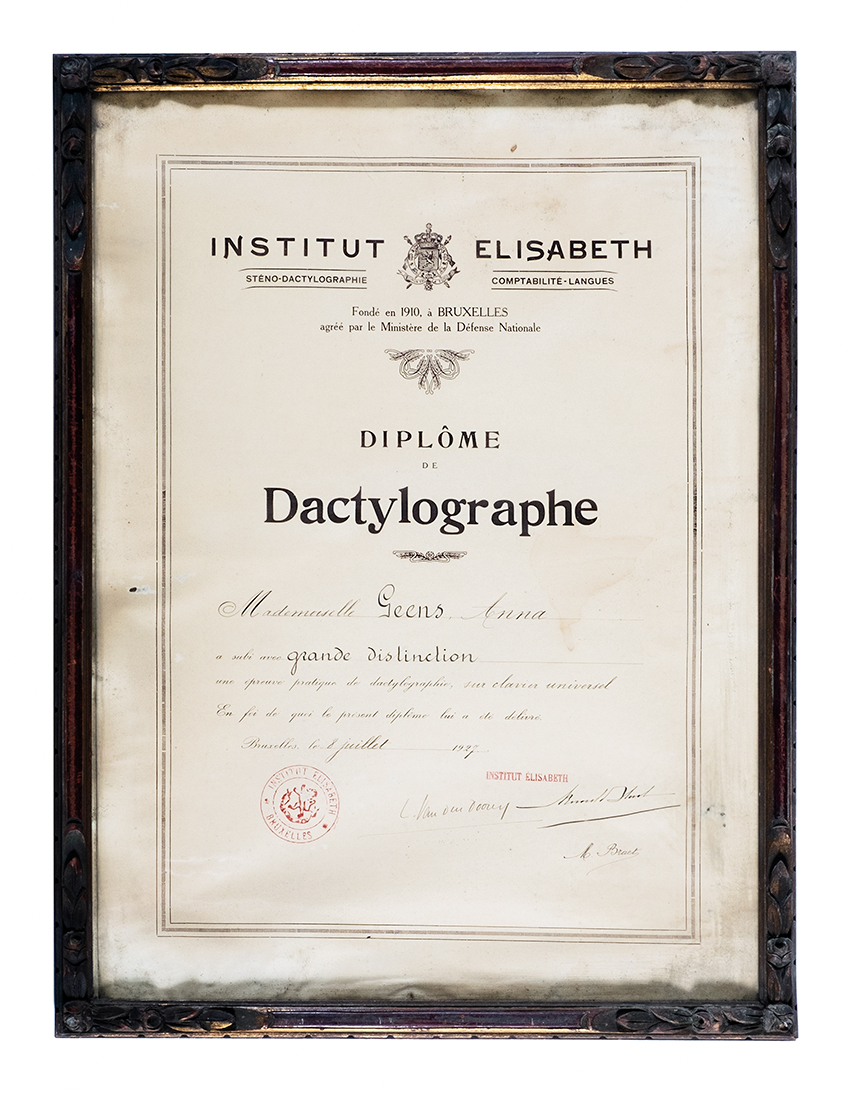 Typediploma van het Institut Elisabeth (Brussel) uitgereikt aan Anna Geens uit Sint-Jans-Molenbeek, 1927.
