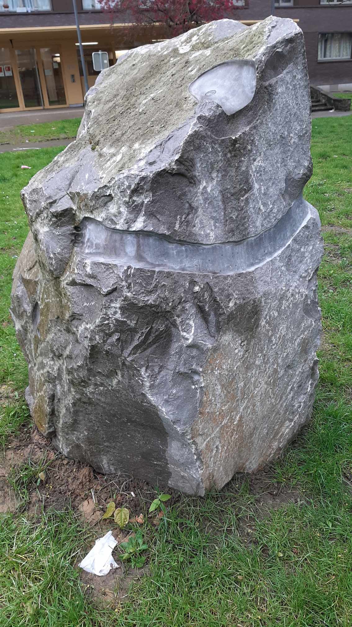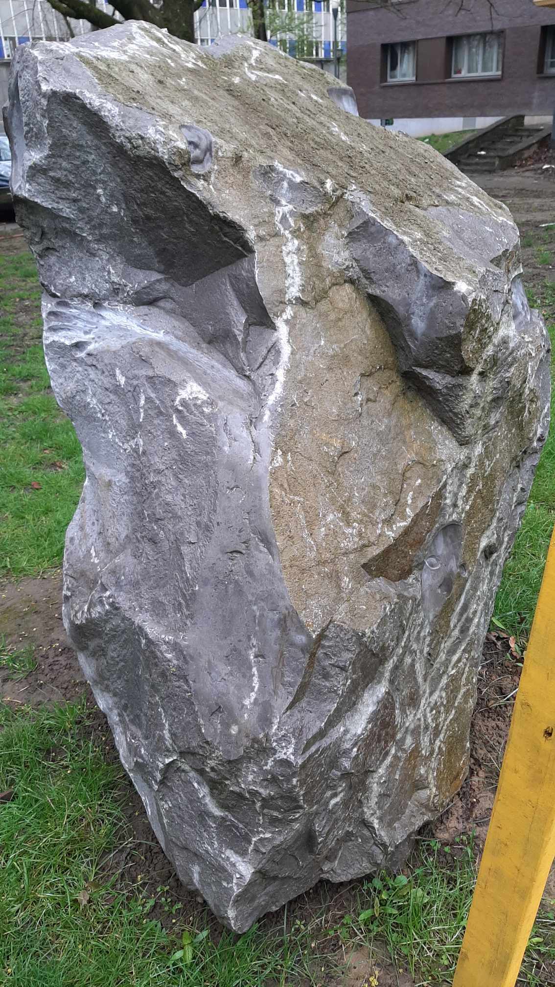 Een stuk kalksteen uit Longpré, dat aan de kunstenaar werd geschonken, waarvan de verschillende zijden zijn gebeeldhouwd en gegraveerd met afdrukken van handen en gezichten.