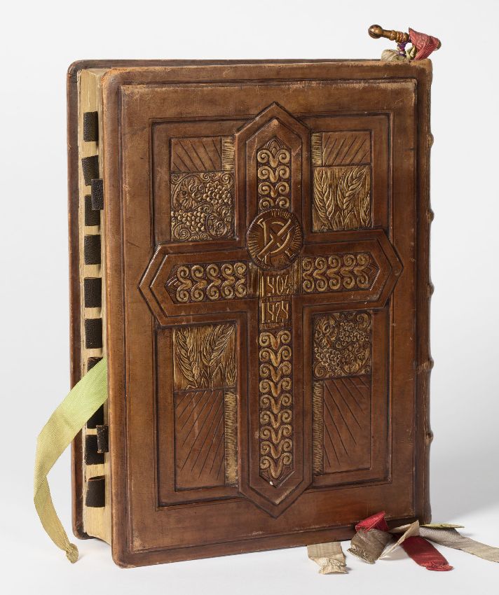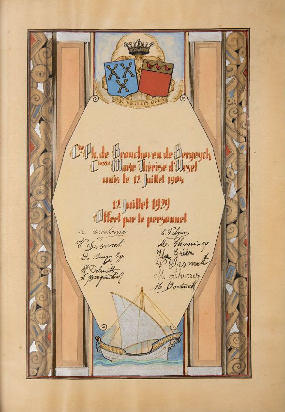 "Cte. Ph. de Brouchoven de Bergeyck / Ctesse Marie Thérèse d'Ursel / unis le 12 Juillet 1904 / 12 Juillet 1929 Offert pas le personnel"